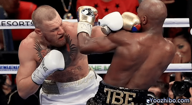 第一次交手,嘴炮在开场狂风暴雨一般的进攻点燃了所有人,但梅威瑟本身就擅长防守,再加上拳击的手套好UFC的手套是不同的,所以其实嘴炮很多都是无效击打。当梅威瑟开始发力之后,虽然年龄更大,但更懂得规则、合理运用体能的他在第10回合就KO了嘴炮,表现强势。