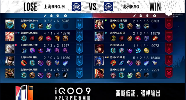 2分12秒,苏州KSG控下暴君。3分33秒,野区团,双方打出1换1,苏州KSG张飞拿下一血。4分32秒,苏州KSG控下先知主宰。4分45秒,野区团,苏州KSG击杀关羽。5分12秒,苏州KSG破掉上海RNG.M下一塔。5分35秒,上海RNG.M下路击杀橘右京,随后破掉苏州KSG下一塔。6分11秒,苏州KSG破掉上海RNG.M中一塔。7分54秒,上海RNG.M破掉苏州KSG上一塔。8分03秒,中路团,苏州KSG击杀关羽。9分21秒,苏州KSG破掉上海RNG.M上二塔。10分09秒,苏州KSG破掉上海RNG.M下二塔,随后团战打出1换2。11分10秒,苏州KSG拿下暗影主宰。11分35秒,上海RNG.M上路击杀狄仁杰。11分50秒,上路团,上海RNG.M打出1换4,随后苏州KSG橘右京拿下双杀。14分56秒,苏州KSG拿下暗影主宰。15分26秒,上海RNG.M控下暗影暴君。15分30秒,中路团,苏州KSG打出2换3,随后破掉高地塔点掉水晶连下三城终结比赛。