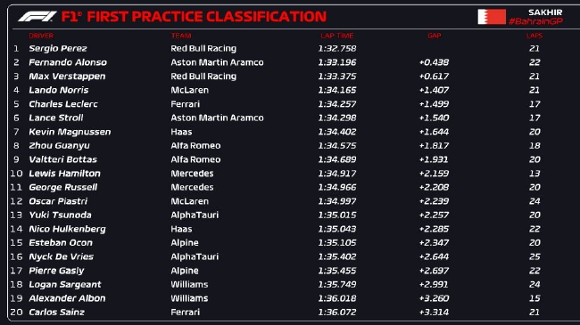 2023赛季F1巴林大奖赛第1次练习赛成绩表: