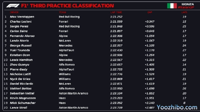 2022年F1意大利大奖赛第3次练习赛成绩表