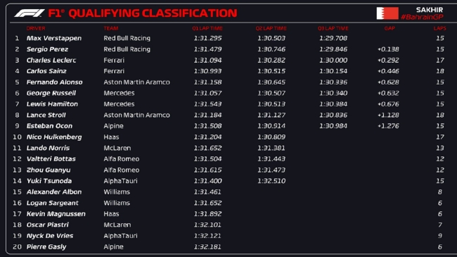 24直播网讯 2023F1巴林大奖赛排位赛结束,红牛车队维斯塔潘杆位,他的队友佩雷兹第二,红牛车队包揽头排发车位。法拉利车队勒克莱尔和塞恩斯三四位。阿隆索第五,拉塞尔第六,汉密尔顿第七,斯托尔第八,奥康第九,霍肯伯格第十。周冠宇第13。
