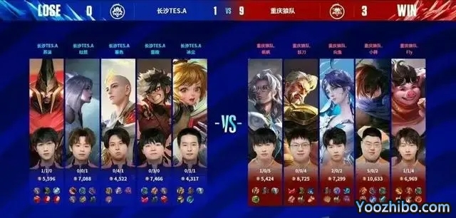 第一局,长沙TESA拿到了露娜+孙尚香。重庆狼队红色方,拿到了凯+李元芳。开局重庆狼队击杀太乙真人,拿下一血。10分钟,重庆狼队先手秒掉露娜,一波零换四,直推中路一塔。15分钟,重庆狼队经济差领先7千。决胜团,重庆狼队小胖凯开大抗住巨额伤害,重庆狼队直点水晶,先下一局。