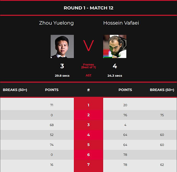首第一局,周跃龙26-16,周跃龙二K留下机会,瓦菲机会球不进,周跃龙单杆45分超分,周跃龙解到咖啡球犯规,周跃龙71-20拿下第一局。第二局,瓦菲1分,防守比拼,周跃龙留下机会,瓦菲单杆75分拿下。双方1-1。第三局瓦菲防守不到位率先漏球,周跃龙准度在线,得到29分转入防守,随后他多次上手打出68-4赢得缠斗。