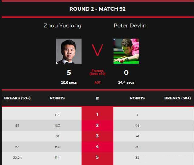 本场比赛,周跃龙打得非常有气势,5-0轻松战胜对手。第一局,周跃龙进入状态较快,他通过几次上手,83-1先胜一局,1-0取得开门红。 第二局,德夫林手感有所提升,周跃龙则送出单杆55分米,103-46再胜一局,2-0领先。