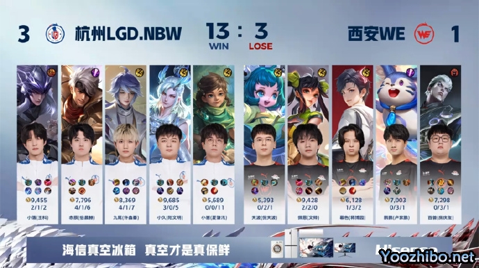 后期LGD五人抱团推进,WE正面难以处理孙膑和杨玉环的续航,LGD造成WE掉点后强点水晶,拿下胜利。