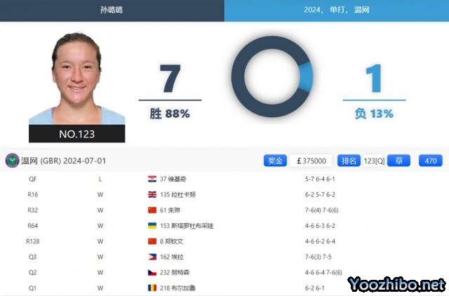 本次温网,孙璐璐从资格赛打起,连赢3场晋级正赛。正赛中又一路过关斩将,打进温网8强,是本届温网的最大黑马。