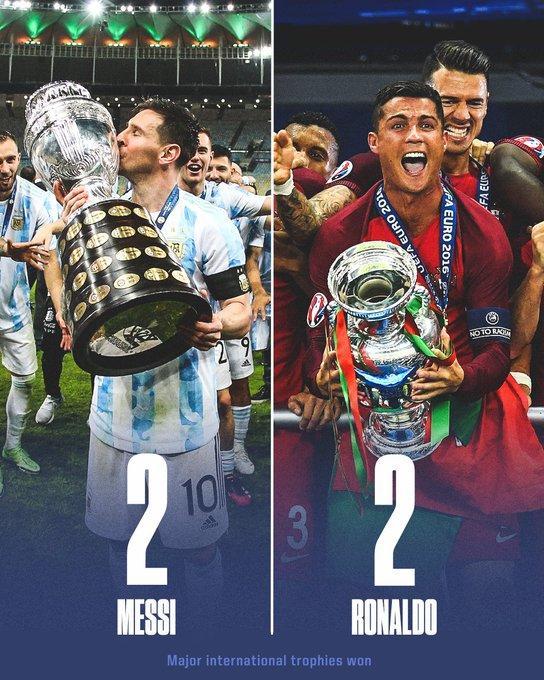 梅西去年夏天拿到了美洲杯冠军,今夏又拿到了欧美杯冠军。而C罗则曾赢得欧洲杯冠军和欧国联冠军。