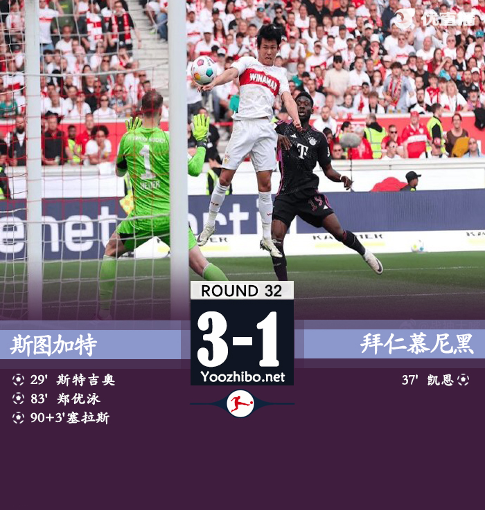 24直播网讯:北京时间5月4日21:30,德甲联赛第32轮拜仁挑战斯图加特的比赛,上半场格雷罗伤退,戴尔精彩门线解围,斯特吉奥挑射破门,格纳布里造点凯恩点射破门扳平比分,半场结束,斯图加特1-1拜仁。下半场舒波莫廷失单刀,郑优泳头球反超比分,塞拉斯补时推射杀死比赛,最终拜仁1-3斯图加特,拜仁将在四天后欧冠半决赛客场挑战皇马。