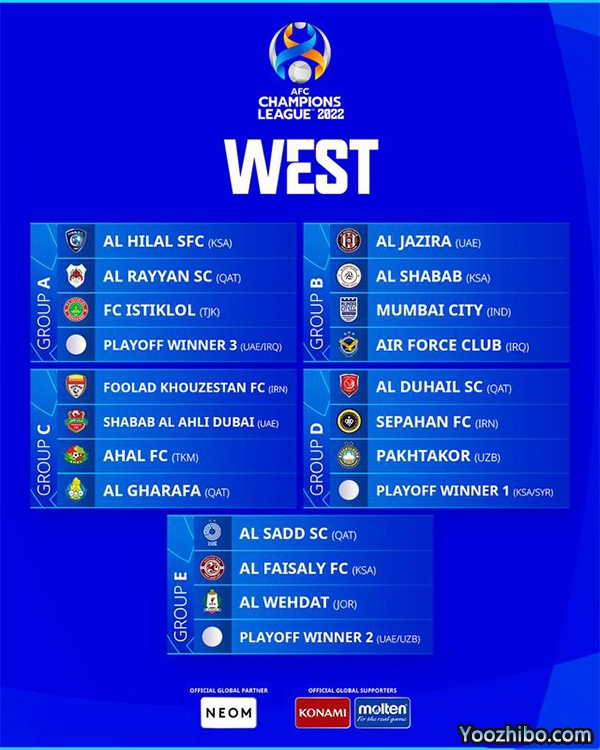 A组:新月(沙特)、赖扬(卡塔尔)、伊提洛尔(塔吉克斯坦)、附加赛3(沙迦(阿联酋)vs泽乌拉(伊拉克))