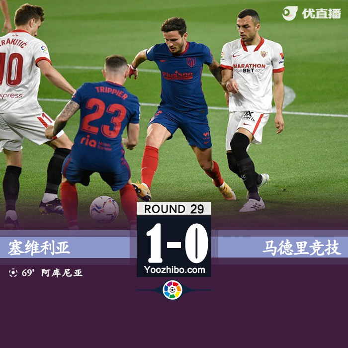 24直播网讯 4月5日讯 北京时间04月05日星期一03:00,西甲第29轮塞维利亚迎战马德里竞技。上半场拉基蒂奇造点,奥布拉克扑点,马竞半场0-0塞维利亚。下半场,阿库尼亚首开记录。最终,塞维利亚主场1-0力克马竞。在同轮次情况下,马竞的领先优势仅剩3分。