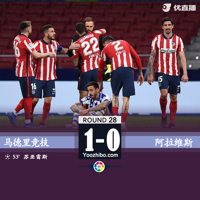 24直播网3月22日讯 北京时间3月22日1点3分,西甲第28轮马德里竞技主场对阵阿拉维斯。上半场,两队都没有创造出绝对有威胁的机会。下半场,苏亚雷斯头球攻门为马竞打破僵局,略伦特射中横梁,萨维奇送点,奥布拉克扑点,全场比赛结束,马德里竞技1-0阿拉维斯。