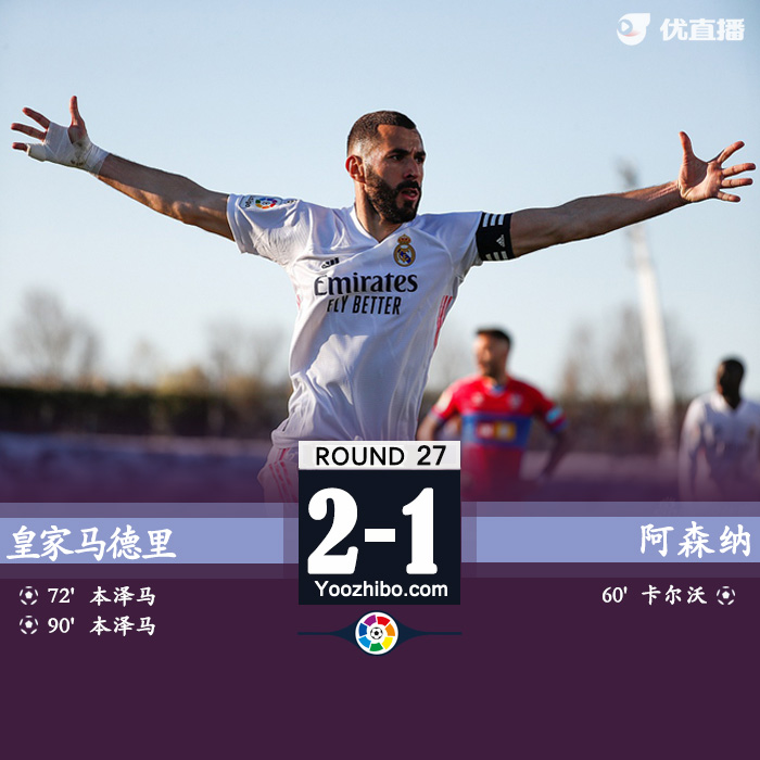 24直播网3月14日讯 北京时间3月13日晚23点15分,2020-21赛季西甲第27轮在迪斯蒂法诺球场展开角逐,皇家马德里坐镇主场迎战埃尔切。上半场双方均无建树,下半场卡尔沃先拔头筹,本泽马头球扳平,阿扎尔复出替补登场,本泽马补时绝杀。最终皇家马德里主场2-1逆转埃尔切。积分榜方面,皇马落后榜首马竞5分,暂居第2名。