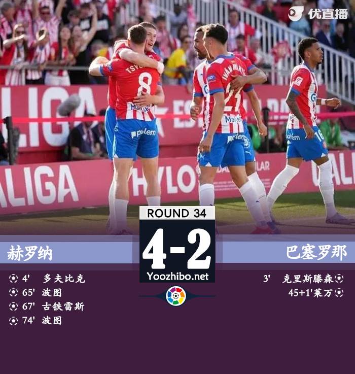 24直播网讯:北京时间5月5日凌晨0时30分,2023-24赛季西甲第34轮在蒙蒂里维球场展开角逐,巴塞罗那客场挑战赫罗纳。上半场克里斯滕森凌空斩,赫罗纳闪电扳平,亚马尔造点,莱万2场进4球,下半场巴萨9分钟连丢3球,罗贝托失误送礼,波图替补2射1传。最终巴萨客场2-4不敌赫罗纳,巴萨本赛季遭赫罗纳双杀,积分榜方面,巴萨积73分下滑至第3,赫罗纳锁定前四队史首进欧冠,皇马提前4轮夺得西甲冠军。